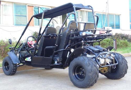 Affordable FUN 300 XRS 4-Seater Buggy Go Kart 300cc CVT Automatic with Reverse features an 18 HP Powerful 300cc CVT fully automatic with reverse engine, air cooled. Steel Wheels with Large tires with 20X7-8 in the front and 22X10-10 in the back. It is made of heavy duty frame, net weights 608 lbs with a max load capacity of 800 lbs! Both front driver and passenger seats are adjustable with driver side pedal to center seat back adjustable from 41” to 46”, fits driver/passenger up to 6’2 in height.