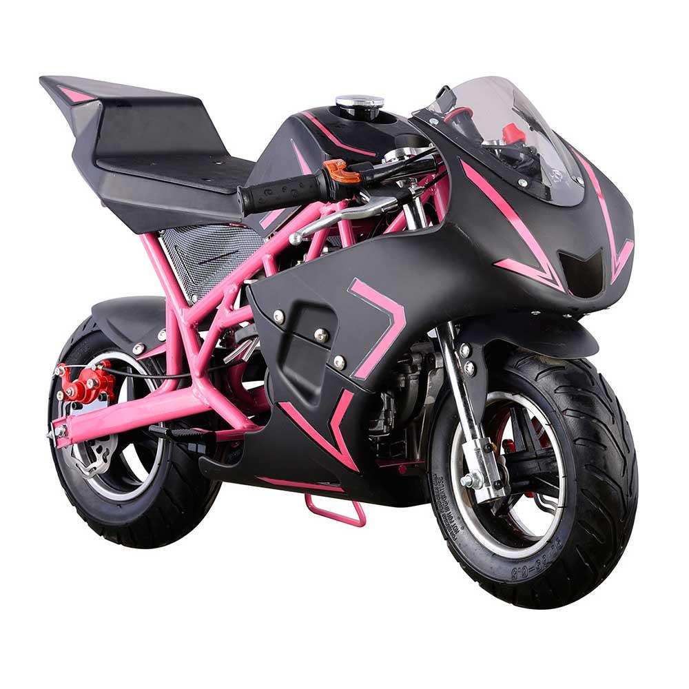 Go-Bowen 40cc pocket bike G00001 gas powered mini motorcycle has a 40cc four-stroke engine and getsĀ over 50 miles per hour!Ā This little can carry up to a 165 pound rider! The G00001 features a sturdy steel frame, chain drive, front, rear disc brakes, and real pneumatic tires. It's just like the big boy bikes in terms of style and sturdiness. Ships UPS Ground.