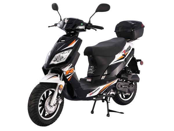 Affordable FUN THUNDER 50 (formally BLADE 50) scooter is powered by a gas efficient 50cc, air-cooled, 4-stroke engine to produce good strong power for acceleration while keeping great 115 MPG equipped with electric/kick starting method, Sports wheel/tires, dual stage paint treatment, halogen bulbs, high quality polyurethane seat, and lockable rear trunk.
