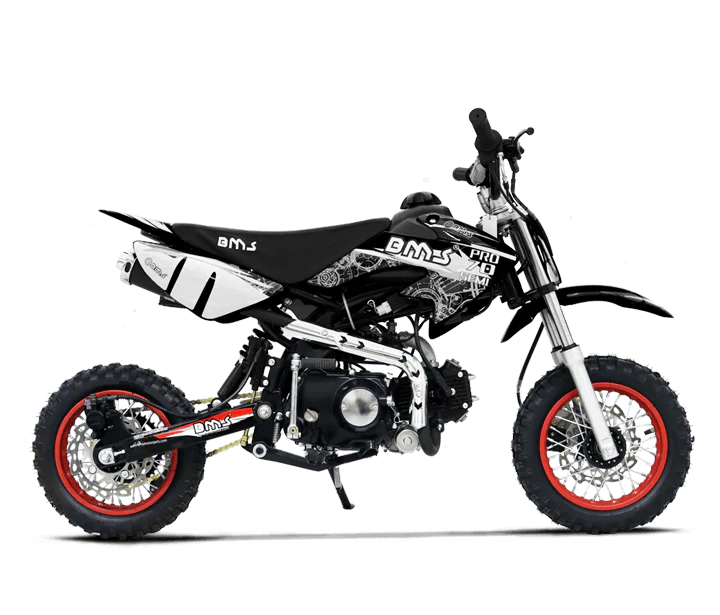 BMS PRO 70 SEMI DIRT BIKE 70cc 4-Stroke mini bike is great for the young riders, to focus on techniques and riding skills. The smooth 70cc semi-auto transmission and great suspension, Electric/Kick Start, 16mm Carburetor, 2 Stage Air Filter, Seat Height 22 in.