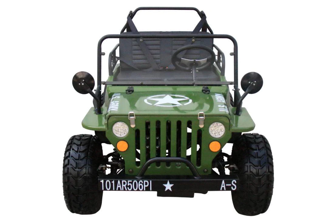 Affordable FUN 125cc Willy WWII Army Jeep semi-automatic 3 speed with reverse 2 seater top speed 32mph lots of FUN features iconic decals showcasing the US Army and US Marine Corp. Be a hero and shred dirt in red, blue, camouflage green, or dark green. Hoorah!