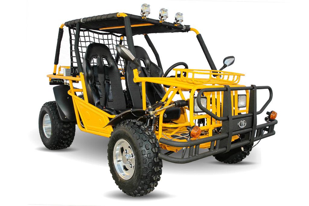 Affordable FUN The HUMMER KD-200GKH two-seater gokart features cool safari styling, utility racks, big 21 and 22 inch wheels and a powerful 177cc, four-stroke engine for getting through the toughest terrain. Single speed gearing makes this machine super simple to operate and includes reverse for getting out of tight spots! Front and rear hydraulic disc brakes, a full compliment of lights and sport bucket seats with safety harnesses round out the ammenities on this fun go kart. All new models now come with bright polished aluminum wheels! Available in several great colors! WHEELS STEEL BLACK NOT ALLOY.
