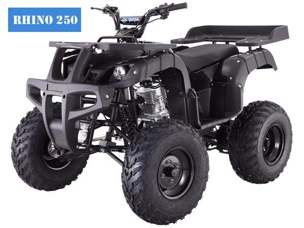 High-output 200cc engine Tao Tao Rhino 250 is a powerhouse utility ATV with manual 4-speed transmission and Reverse for ultimate maneuverability rider control, as well as a double A-arm front suspension, heavy duty swing arm rear suspension for smooth rides over rough places.